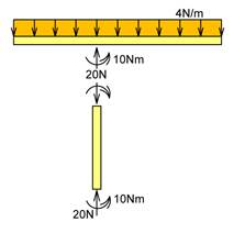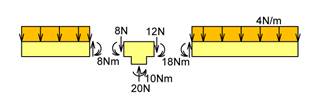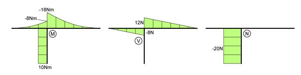 Legg merke til momentdiagrammets parabelform som hele veien er på oversiden av bjelken og sammenhengen mellom de tre momentene som møtes i knutepunktet. Legg også merke til sammenhengen mellom skjærkraftdiagrammet og normalkraftdiagrammet; spranget i skjærkraftdiagrammet tilsvarer normalkraften.
